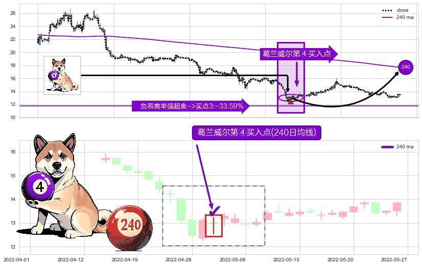 形态多维评估: ⚀ 2022-04-28-日显现 葛兰威尔均线 240日均线 第④买入点 下降趋势均值回复的短线反弹信号,后市看涨,买进信号