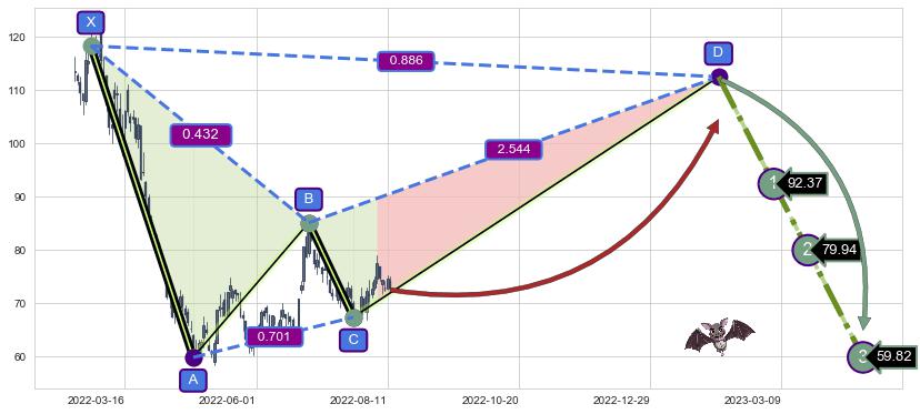➣ 未完成【蝙蝠】形态起点X: 2022-02-25, 已到达C点: 2022-07-25, 预测最终D点: 2023-02-03, 共235交易日