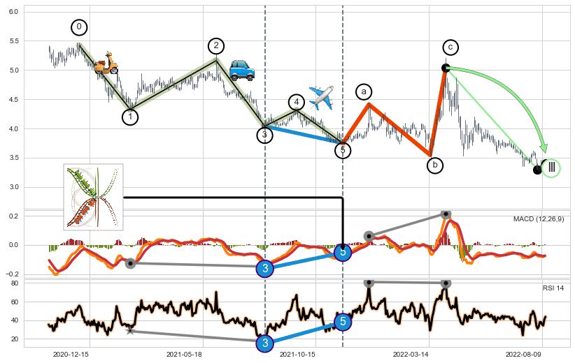 ➢ a,c调整浪MACD, RSI, KDJ走势都【未出现】背离,abc走势延续, 5浪反转概率增强