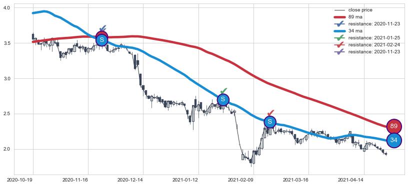 下跌趋势2020-10-19-2021-04-26,均线89, 34确认关键阻力3处