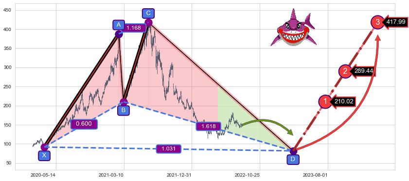 ➣ 未完成【鲨鱼】形态起点X: 2020-03-23, 已到达C点: 2021-06-25, 预测最终D点: 2023-03-10, 共661交易日