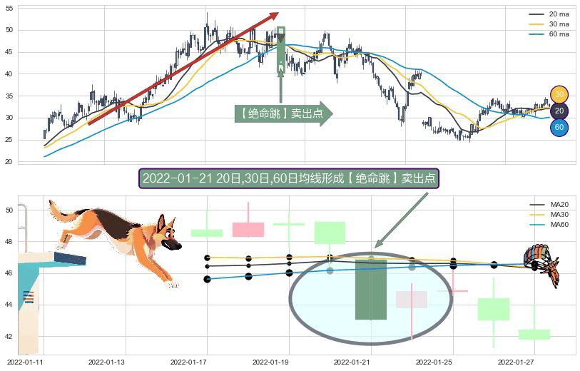 ⚀ 2022-01-21日显现 20日-30日-60日均线 【绝命跳】卖出点 看空信号,后市看跌,卖出