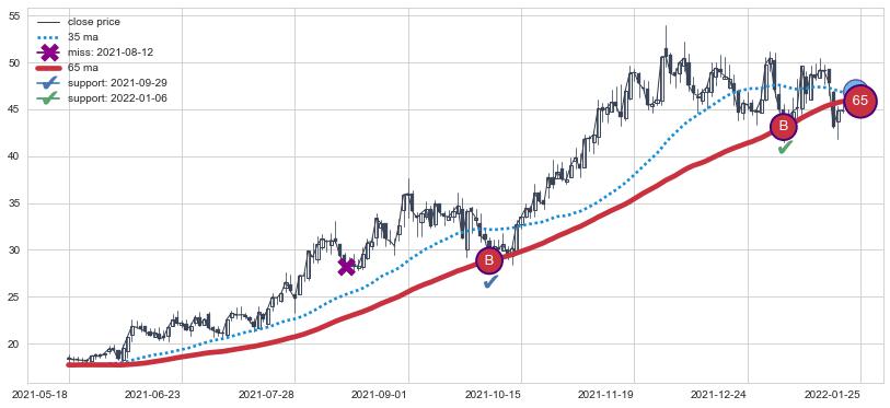⚅ 买点向上突破均线后,价格走势很纠结,不断在均线周围试探,有再次下探破位均线的可能
