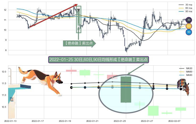 形态多维评估: ⚀ 2022-01-25日显现 30日-60日-90日均线 【绝命跳】卖出点 看空信号,后市看跌,卖出