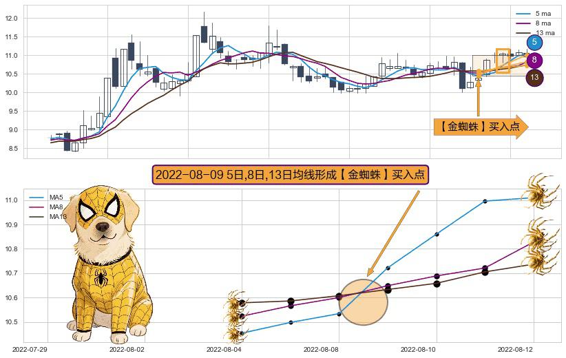 形态多维评估: ⚀ 2022-08-09日显现 5日-8日-13日均线 【金蜘蛛】买入点 看多信号,后市看涨,买入