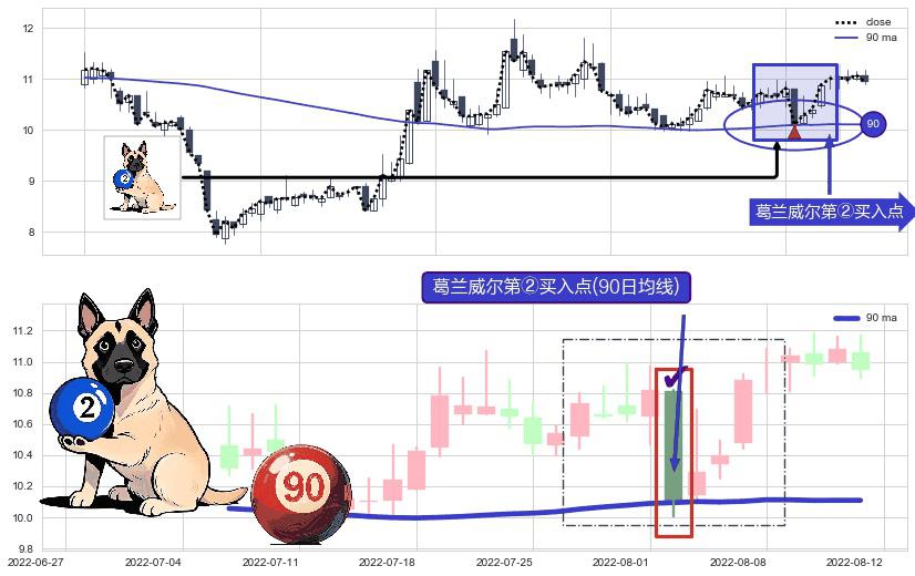 形态多维评估: ⚀ 2022-08-02-日显现 葛兰威尔均线 90日均线 第②买入点 上升趋势的中继信号,后市看涨,买进信号