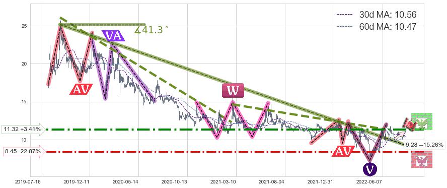 ➢ 【仅预测突破】最后价格:10.95与预测突破价格:11.80→【空间中等】后续最小【反转】第一目标价格→(2022-10-14: 15.25 )
