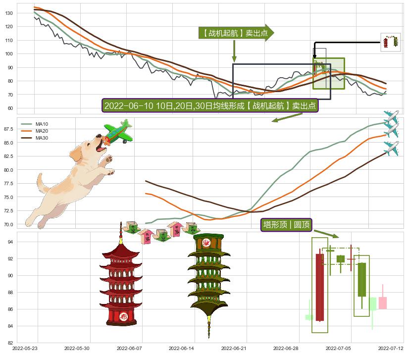 | 2 🅚:下跌两颗星 | 下跌三颗星 ➕ 🎢:【战机起航】卖出点均线组合卖出点信号形成后,猜想后续上行结束,持续回落下跌(均值回复) ☞ 看空信号 ⇥ 【均线】交织【🅚线】⇥ 综合量化分数: 45 | > |