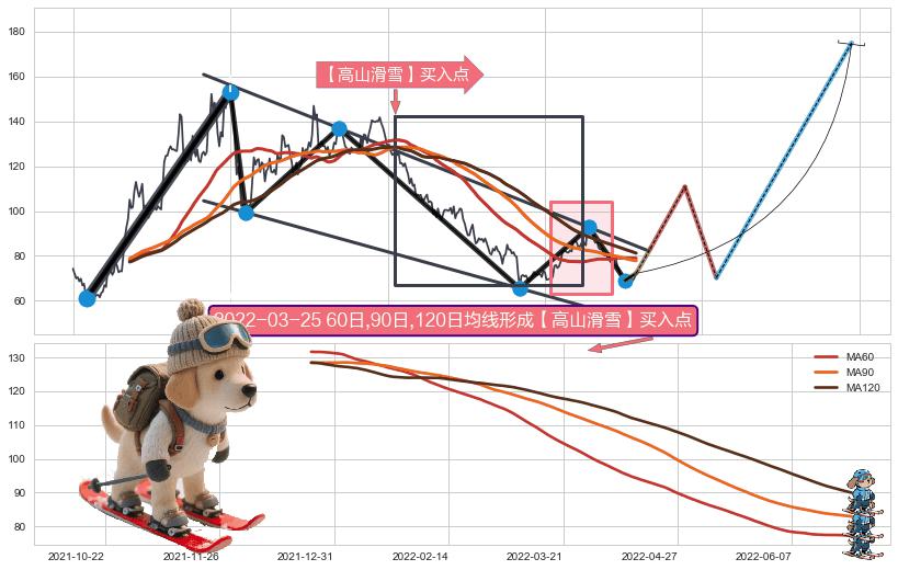 从2021-12-10至2022-04-26,共包含90个交易日,阶段股价下跌-73.79%,阶段股价变动位移路程比: 1 : 2