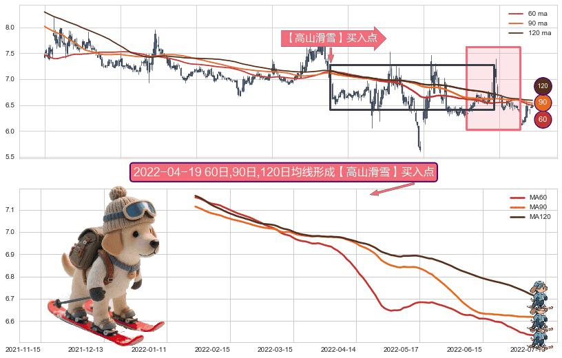 ⚀ 2022-01-24日-2022-07-07日显现 60日-90日-120日均线 【高山滑雪】买入点 看多信号,后市看涨,买入