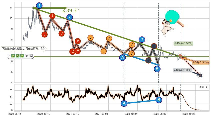 ♘ 在最后的下跌阶段2020-07-13至2022-05-09,存在 破位边缘的阻力位 ,阻力价格6.43,可信任强度75.89%,其距离最后价格6.49相差 -0.96%