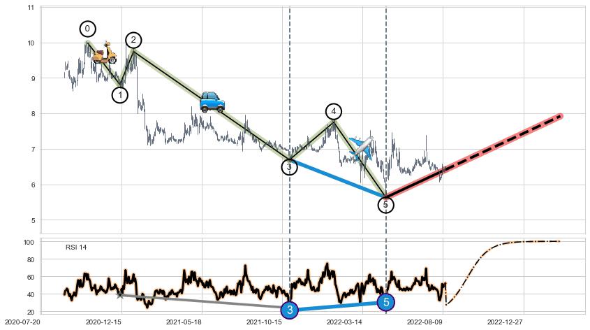 | 2 🅚:【高山滑雪】买入点 ➕ 🌊:波浪理论猜想下跌浪5已形成,猜想后续形成abc反弹上涨(均值回复) ☞ 看多信号 ⇥ 【均线】交织【图形】⇥ 综合量化分数: 51 | > |