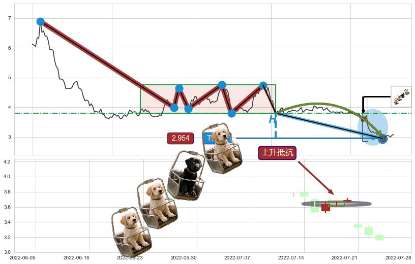 ➢ 高点影线(2022-07-14: 3.810 )→回踩→第一根k线低点(2022-07-08: 3.780 )