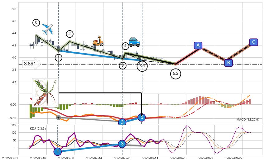 ➣ 5.1: 预测当前第5浪位置(2022-08-03, 3.950),仍然有下跌空间