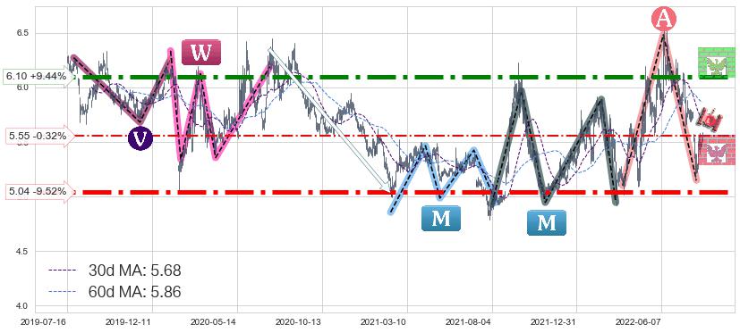 ♘ 支撑价格位5.04,可信任强度98.00%,距离最后交易2022-08-12形成的收盘价格5.57相差 -9.52%