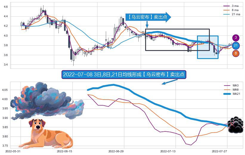 形态多维评估: ⚀ 2022-06-20日-2022-07-28日显现 3日-8日-21日均线 【乌云密布】卖出点 看空信号,后市看跌,卖出