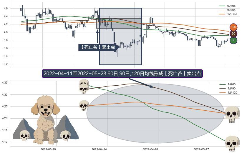 形态多维评估: ⚀ 2022-04-12-日至2022-05-23-日显现 60日-90日-120日均线 【死亡谷】卖出点 看空信号,后市看跌,卖出