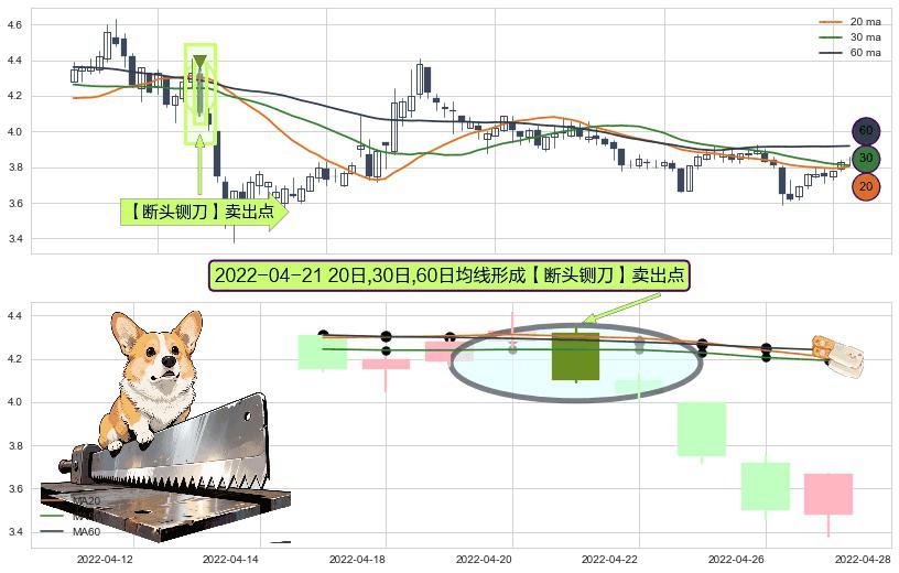 形态多维评估: ⚀ 2022-04-21日显现 20日-30日-60日均线 【断头铡刀】卖出点 看空信号,后市看跌,卖出