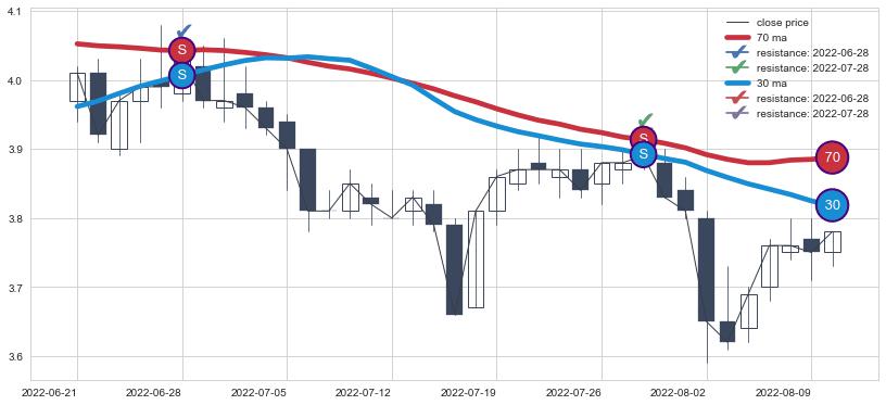 下跌趋势2022-06-21-2022-08-10,均线70, 30确认关键阻力2处
