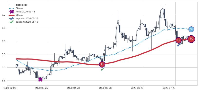 上涨趋势2020-02-26-2020-08-04,均线70确认关键支撑2处