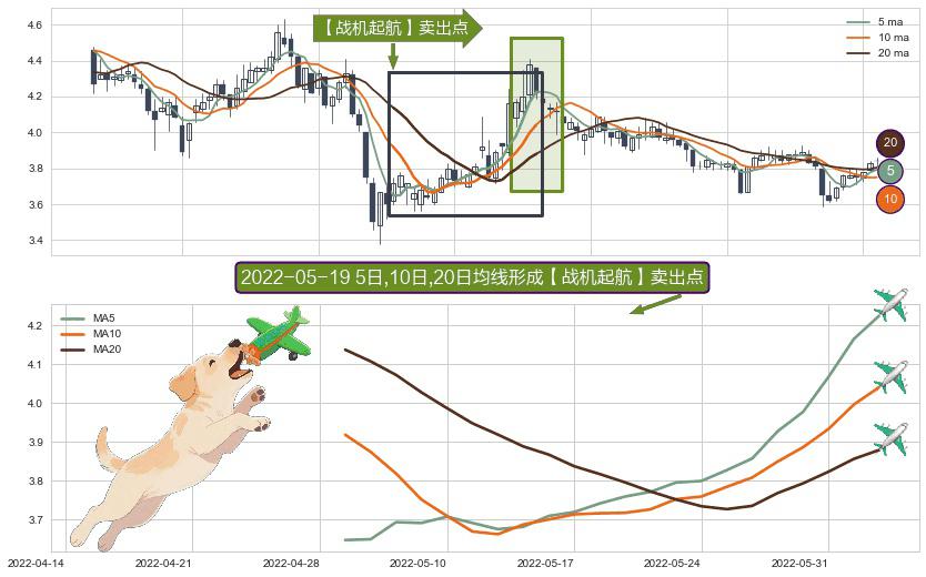 形态多维评估: ⚀ 2022-04-29日-2022-06-02日显现 5日-10日-20日均线 【战机起航】卖出点 看空信号,后市看跌,卖出