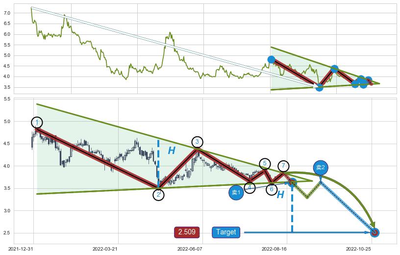 ➢ 【多方力量耗尽,空方打破攻守平衡点】下降三角形中继整理, 已在2022-04-25突破【支撑】颈线 3.890 →演变成下降通道