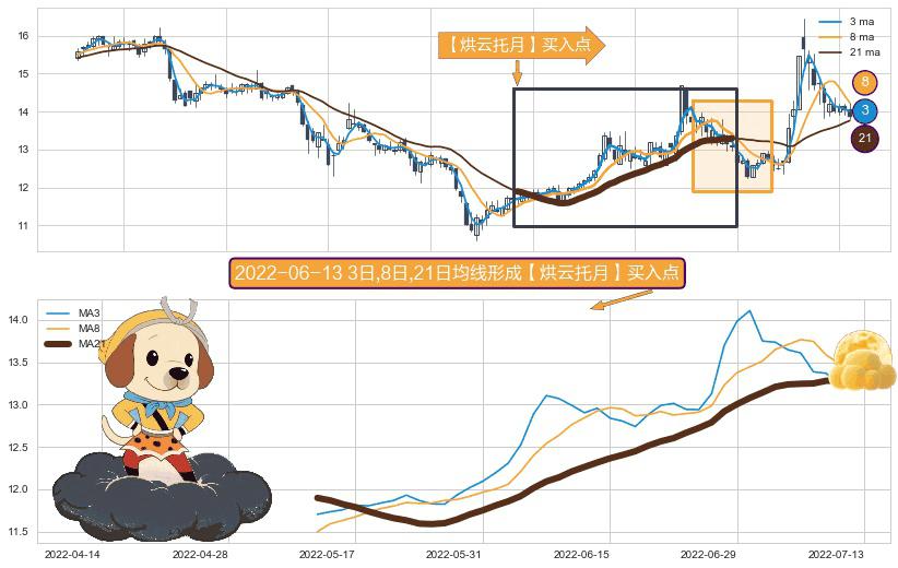⚀ 2022-05-12日-2022-07-12日显现 3日-8日-21日均线 【烘云托月】买入点 看多信号,后市看涨,买入