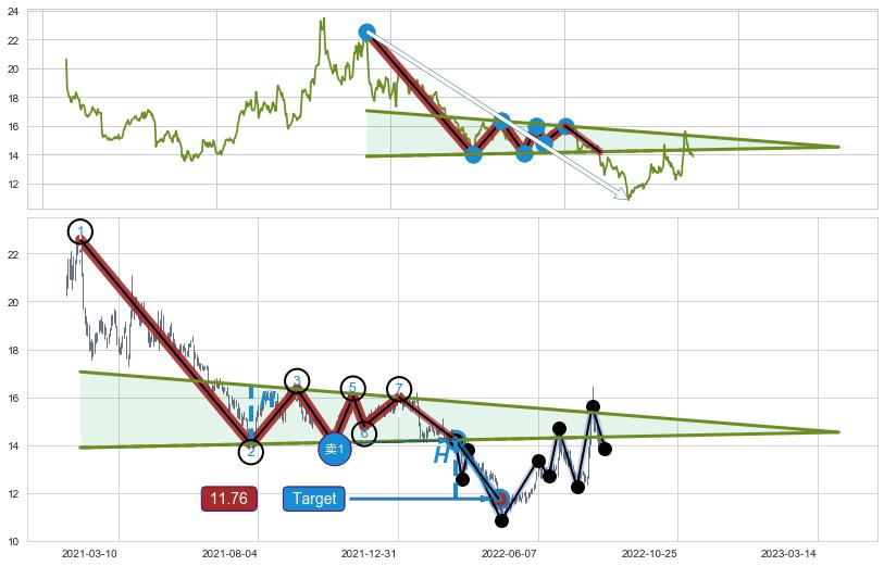 ➢ 【卖1】: 激进型 卖点→(2022-03-08: 14.21 )形成突破下降【对称】三角形整理【整理】形态