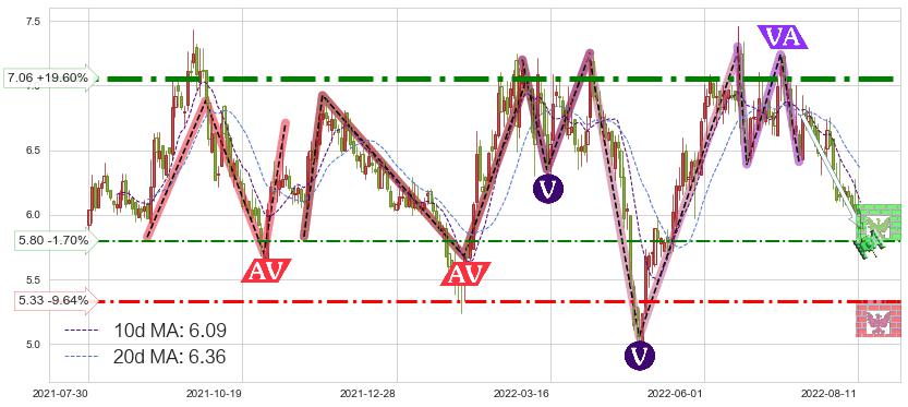 ♘ 阻力价格位5.80,可信任强度52.83%,距离最后交易2022-08-12形成的收盘价格5.90相差 -1.70%
