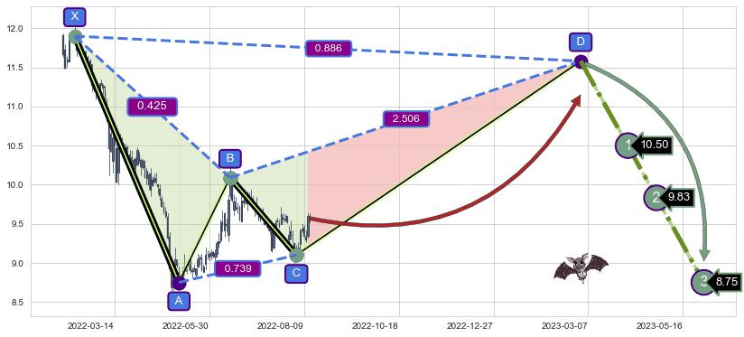 ➣ 未完成【蝙蝠】形态起点X: 2022-02-11, 已到达C点: 2022-08-03, 预测最终D点: 2023-03-01, 共267交易日