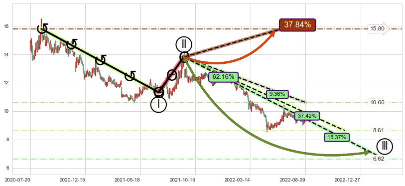 ➣ D点拟合预测价格11.58,距离最后交易收盘价格9.57相差 +21.01%