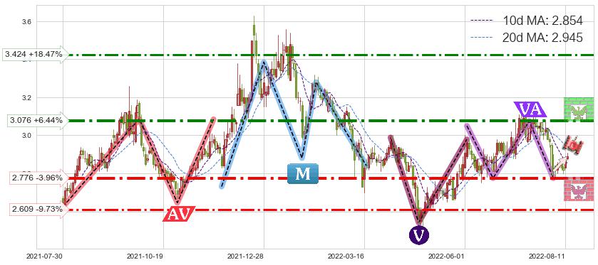 ♘ 阻力价格位3.424,可信任强度59.38%,距离最后交易2022-08-12形成的收盘价格2.890相差 +18.47%