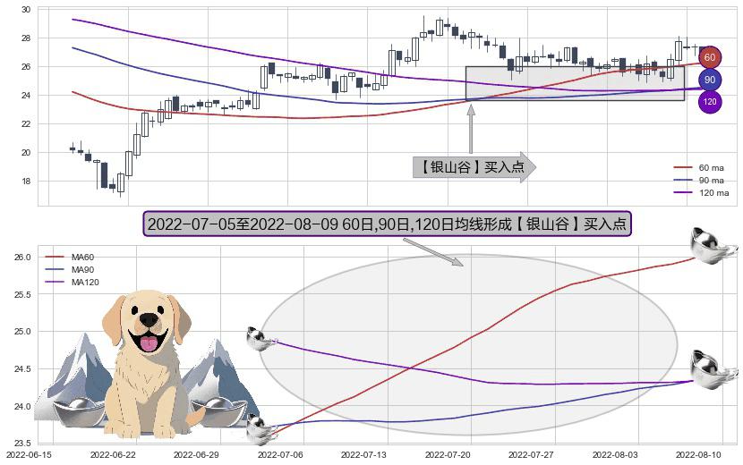 形态多维评估: ⚀ 2022-07-06-日至2022-08-09-日显现 60日-90日-120日均线 【银山谷】买入点 看多信号,后市看涨,买入