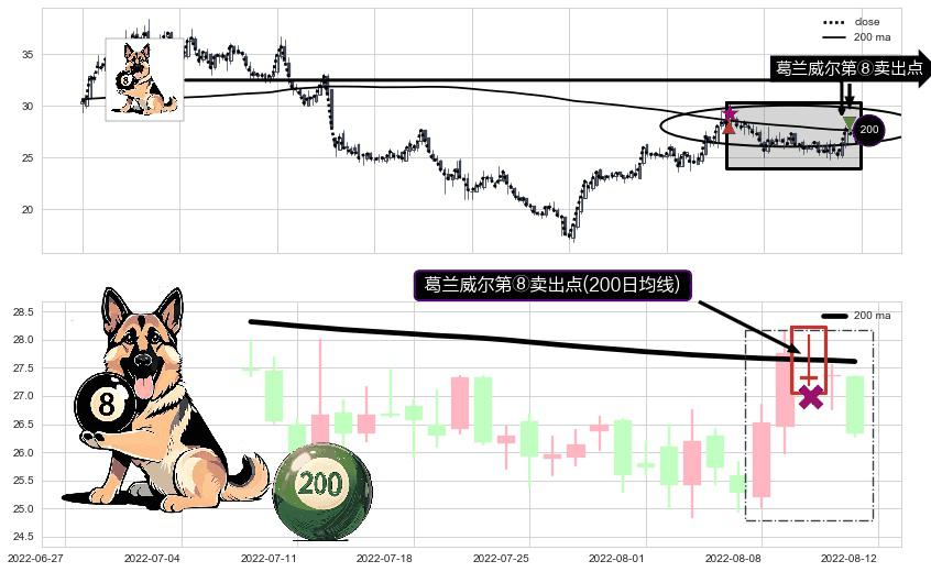 形态多维评估: ⚀ 2022-08-10-日显现 葛兰威尔均线 200日均线 第⑧卖出点 下降趋势的中继信号,后市看跌,卖出信号