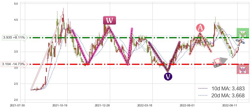 ♘ 阻力价格位3.935,可信任强度81.72%,距离最后交易2022-08-12形成的收盘价格3.640相差 +8.11%