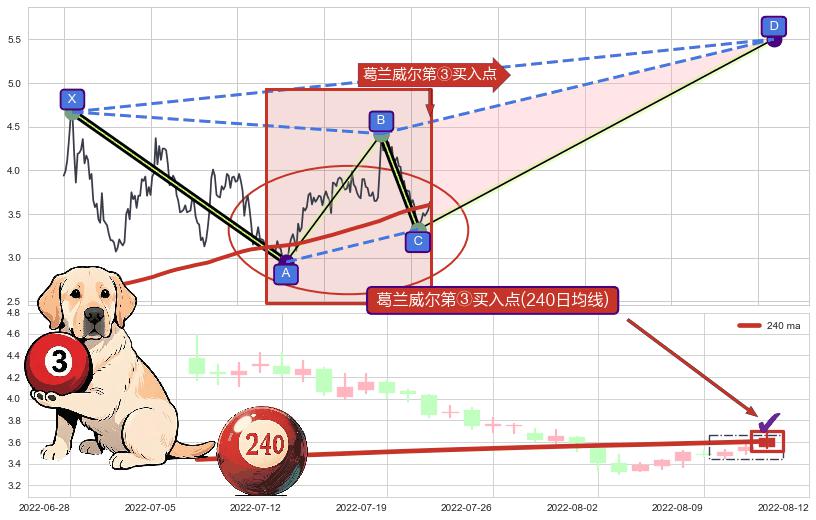 ➣ D点拟合预测价格5.50,距离最后交易收盘价格3.640相差 +51.22%