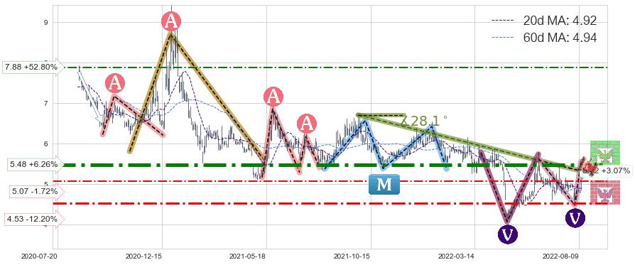 ♘ 阻力价格位5.48,可信任强度91.08%,距离最后交易2022-08-12形成的收盘价格5.16相差 +6.26%