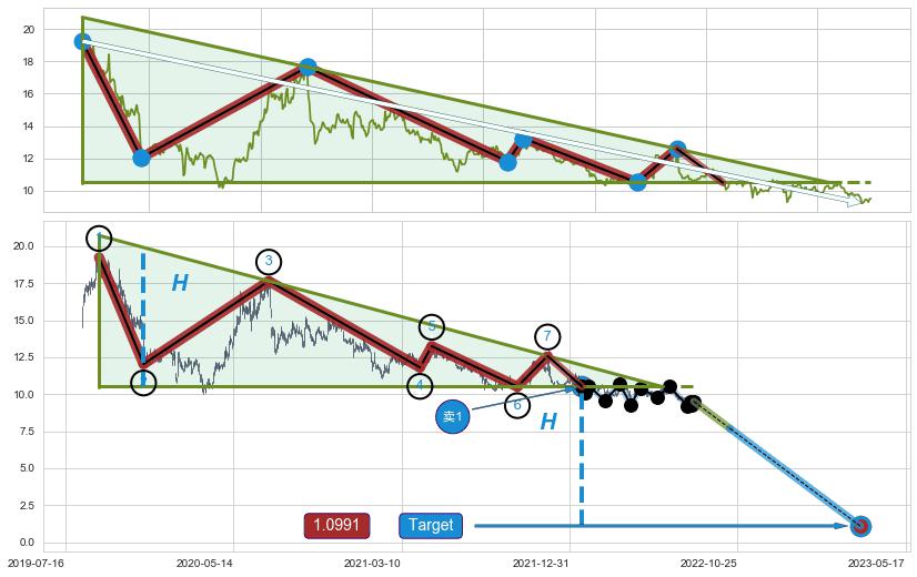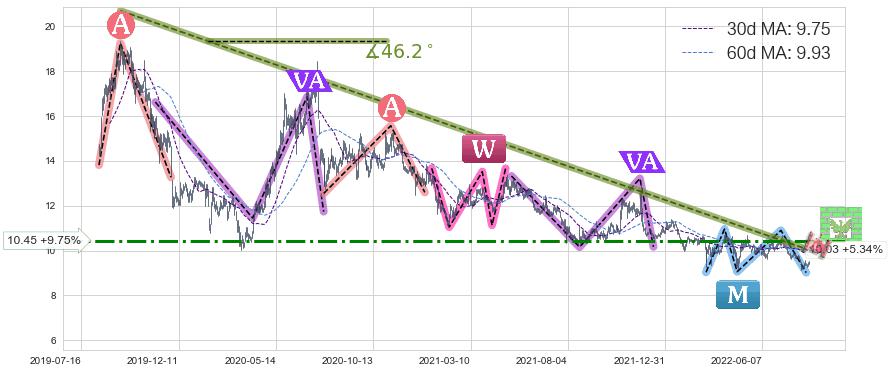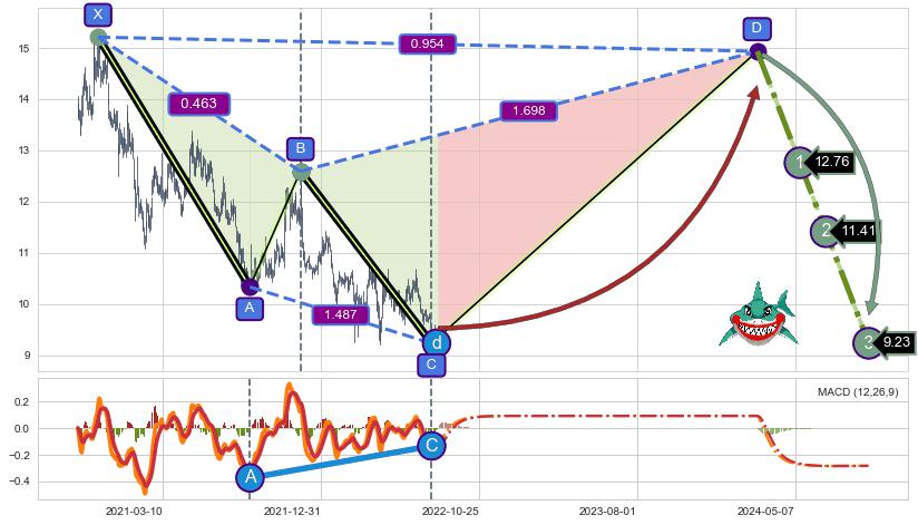 ➣ D点拟合预测价格14.93,距离最后交易收盘价格9.52相差 +56.87%