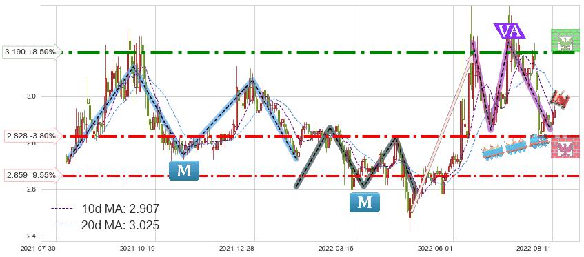 ♘ 阻力价格位3.190,可信任强度92.27%,距离最后交易2022-08-12形成的收盘价格2.940相差 +8.50%