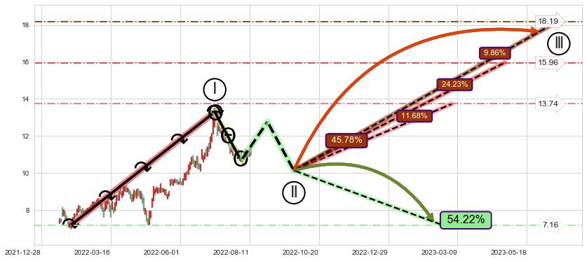 ➢ 循环浪继续向上【最低】位置(2023-03-03, 13.74),匹配聚类样本比例25.52%, 可能性概率11.68%