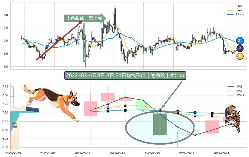 形态多维评估: ⚀ 2022-03-15日显现 3日-8日-21日均线 【绝命跳】卖出点 看空信号,后市看跌,卖出