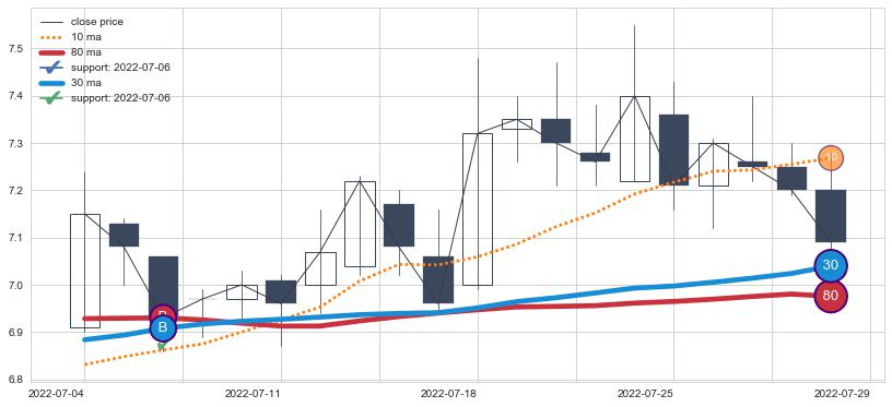 上涨趋势2022-07-04-2022-07-29,均线80, 30确认关键支撑1处
