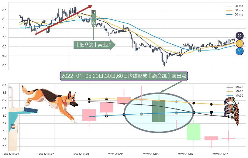 ⚀ 2022-01-05日显现 20日-30日-60日均线 【绝命跳】卖出点 看空信号,后市看跌,卖出