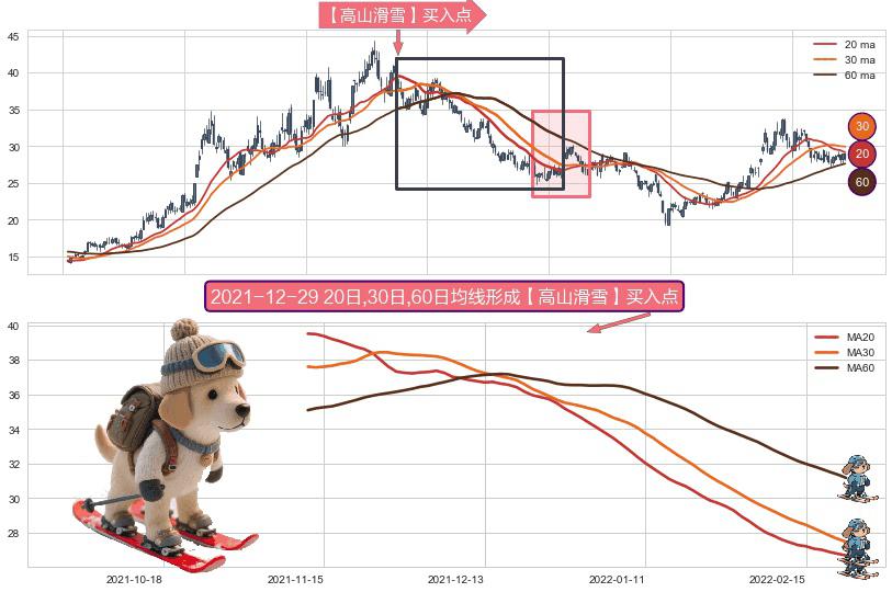 ⚀ 2021-11-11日-2022-02-22日显现 20日-30日-60日均线 【高山滑雪】买入点 看多信号,后市看涨,买入
