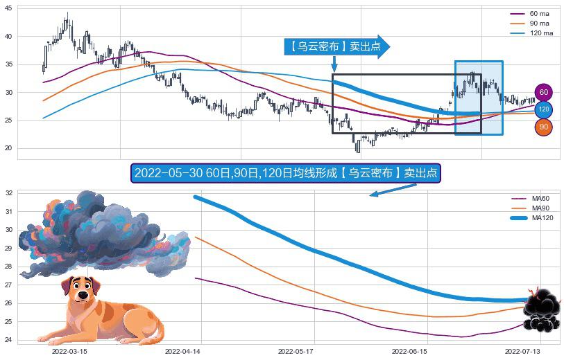 ⚀ 2022-04-13日-2022-07-12日显现 60日-90日-120日均线 【乌云密布】卖出点 看空信号,后市看跌,卖出