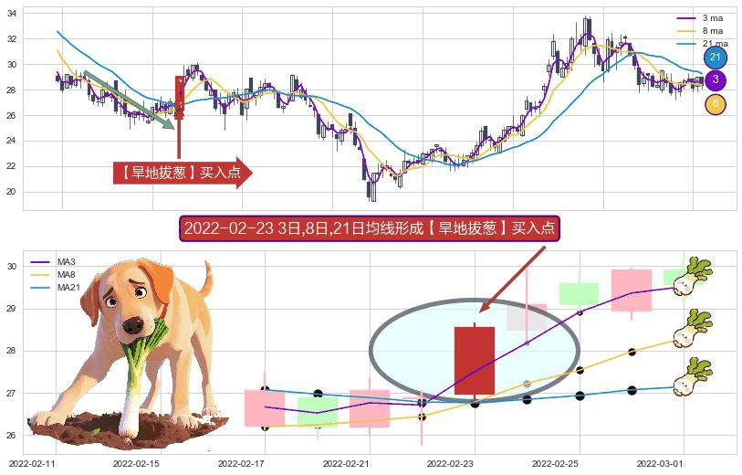 ⚀ 2022-02-23日显现 3日-8日-21日均线 【旱地拔葱】买入点 看多信号,后市看涨,买入