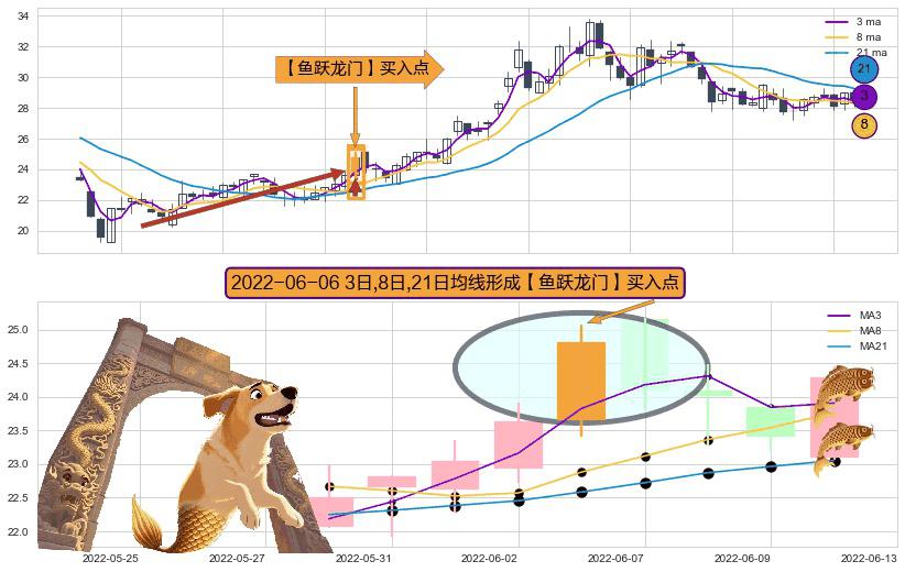 ⚀ 2022-06-06日显现 3日-8日-21日均线 【鱼跃龙门】买入点 看多信号,后市看涨,买入