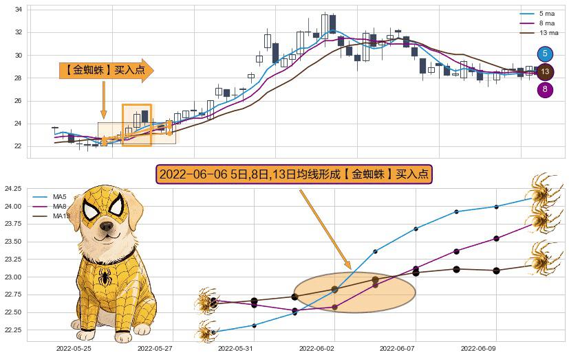 ⚀ 2022-06-06日显现 5日-8日-13日均线 【金蜘蛛】买入点 看多信号,后市看涨,买入