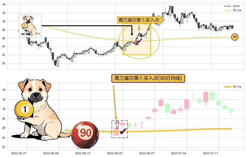 ⚀ 2022-06-17-日显现 葛兰威尔均线 90日均线 第买①入点 走势反转见底信号,后市看涨,买进信号