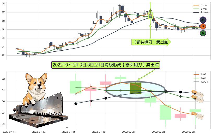 ⚀ 2022-07-21日显现 3日-8日-21日均线 【断头铡刀】卖出点 看空信号,后市看跌,卖出